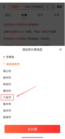 2.输入“专业技术人员资格证书管理服务”,选择“办事”模块,点击下方“专业技术人员资格证书管理服务”,选择办事地区“六安市”,点击“去办理”。